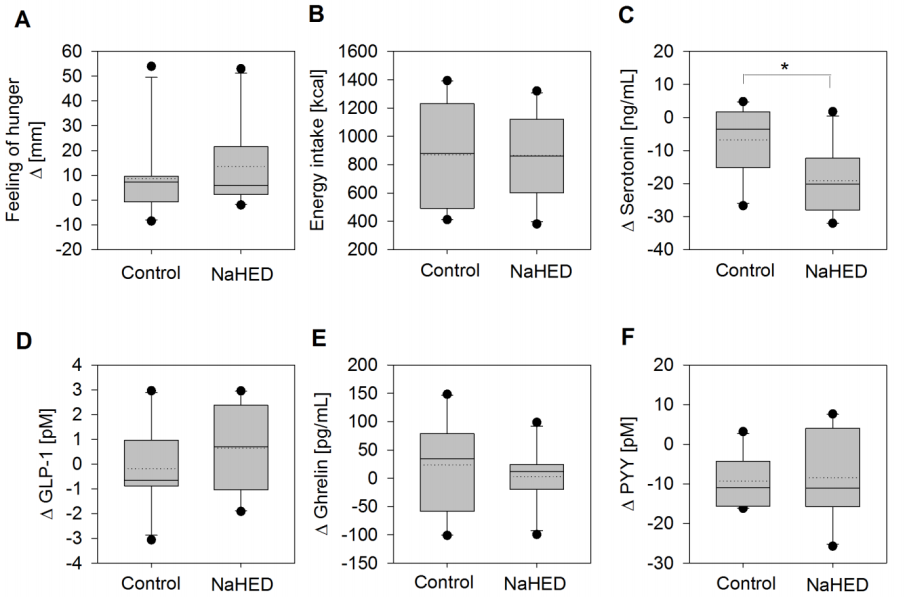 本研究評估了30 mg NaHED單獨給藥或與75 g葡萄糖聯(lián)合給藥對進(jìn)食量和與饑餓和飽腹感調(diào)節(jié)機制的相關(guān)激素的短期影響。