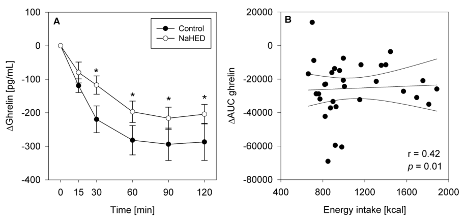 圖2 補充NaHED的葡萄糖溶液可增加胃饑餓素的濃度。在給予75 g葡萄糖(對照組)和補充30 mg NaHED后15、30、60、90和120分鐘血漿胃饑餓素濃度的平均變化(A) (n =17)以及△AUC胃饑餓素與總能量攝入的相關(guān)性(B)。