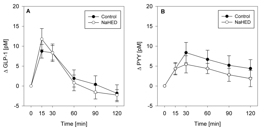 圖3 補充NaHED的葡萄糖溶液不改變血漿GLP-1和PYY濃度。血漿GLP (A)和PYY (B)濃度在對照組和實驗組給藥后15、30、60、90和120 min的平均變化(n =17)。