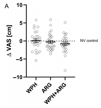 NV對照組受試者的24小時平均卡路里攝入量為2951 ± 141 kcal。與NV對照組相比,WPH + ARG實驗組的24小時卡路里攝入量顯著減少(p < 0.05)。