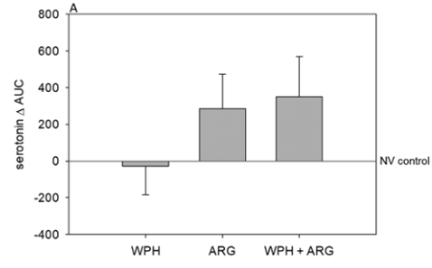 與NV對照組干預(設為0)相比,WPH + ARG聯(lián)合干預增加使血清素濃度顯著升高 (圖2)。NV對照組受試者血清素濃度范圍為0.40至42 pg/mL(ELISA法)。