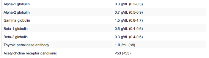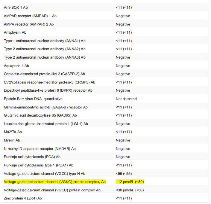 患者的綜合代謝組(CMP)、全血細(xì)胞計(jì)數(shù)(CBC)、維生素B12、B9和促甲狀腺激素(TSH)水平均在正常范圍內(nèi)。腦脊液和血清檢查顯示VGKC復(fù)合物抗體升高至112 pmol/L (正常范圍<80 pmol/L)(表1)。富亮氨酸膠質(zhì)瘤失活蛋白1 (LGI1)和接觸蛋白相關(guān)蛋白2 (CASPR2)抗體均為陰性。