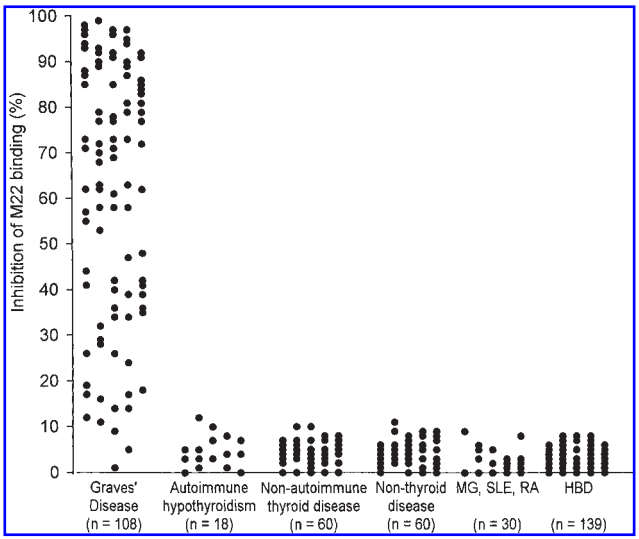 圖3 基于M22-生物素對(duì)TSHR結(jié)合的抑制,使用ELISA檢測(cè)不同患者組的自身抗體。MG,重癥肌無力;SLE,全身性紅斑狼瘡;RA,類風(fēng)濕性關(guān)節(jié)炎;HBD,健康獻(xiàn)血者。