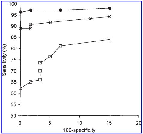 圖5 三種不同TSHR自身抗體檢測(cè)的靈敏度與100-特異性的關(guān)系圖。