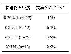 對(duì)一份正?;旌涎暹M(jìn)行64次測(cè)量得到的平均值±標(biāo)準(zhǔn)差(SD)為0.041±0.04 U/L (450 nm處的平均吸光度=2.1±0.079),表明該檢測(cè)法的檢測(cè)下限(2倍SD)為0.12 U/L。