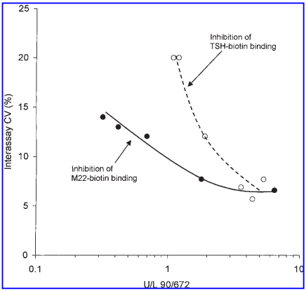 標(biāo)準(zhǔn)物質(zhì)90/672 濃度為0.2 U/L時(shí),對(duì)M22-生物素結(jié)合的抑制率約為10%;濃度為0.8 U/L時(shí),對(duì)TSH-生物素結(jié)合的抑制率約為10%。在基于PEG的實(shí)驗(yàn)中,125I標(biāo)記的TSH結(jié)合抑制率約為10%時(shí),標(biāo)準(zhǔn)物質(zhì)濃度約為2 U/L。