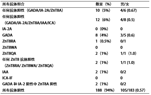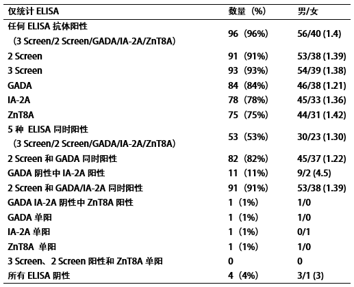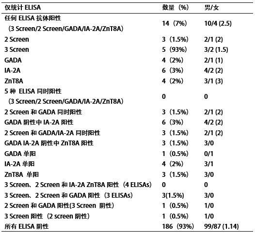 在健康對照中,僅有1例(0.5%)存在多種自身抗體(IA-2A和ZnT8A)陽性。