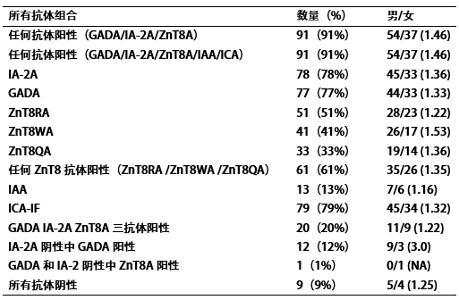 表1 100例1型糖尿病患者的胰島β細胞特異性自身抗體結果