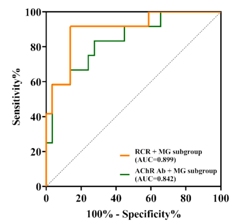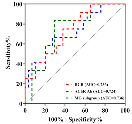 蘇州大學(xué)附屬第一醫(yī)院神經(jīng)內(nèi)科薛群教授團(tuán)隊(duì)最新發(fā)表在《Clinica Chimica Acta》的研究發(fā)現(xiàn):乙酰膽堿受體抗體(AChR-Abs)濃度變化率(RCR)和疾病復(fù)發(fā)風(fēng)險(xiǎn)相關(guān)。RCR結(jié)合MG亞型,ROC曲線的敏感性達(dá)86.2%,特異性91.7%。